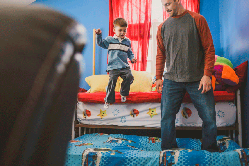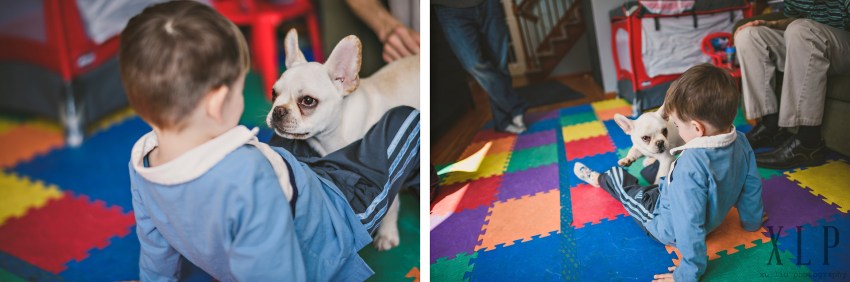 This documentary-style family session took everything we love in our photography – capturing emotions and candid, unplanned moments between people – and crammed it all into an incredible two hours. Between being greeted at the door by a giant black ball of fur, to the quiet moments with baby Levi and Mom and Dad, to the time spent being silly with Cody skillfully leaping across mattresses, we were just amazed by this family. Even Shelly’s brother made it from out of town along with four-month-old Claude the French bulldog, all to participate in the love and joy.